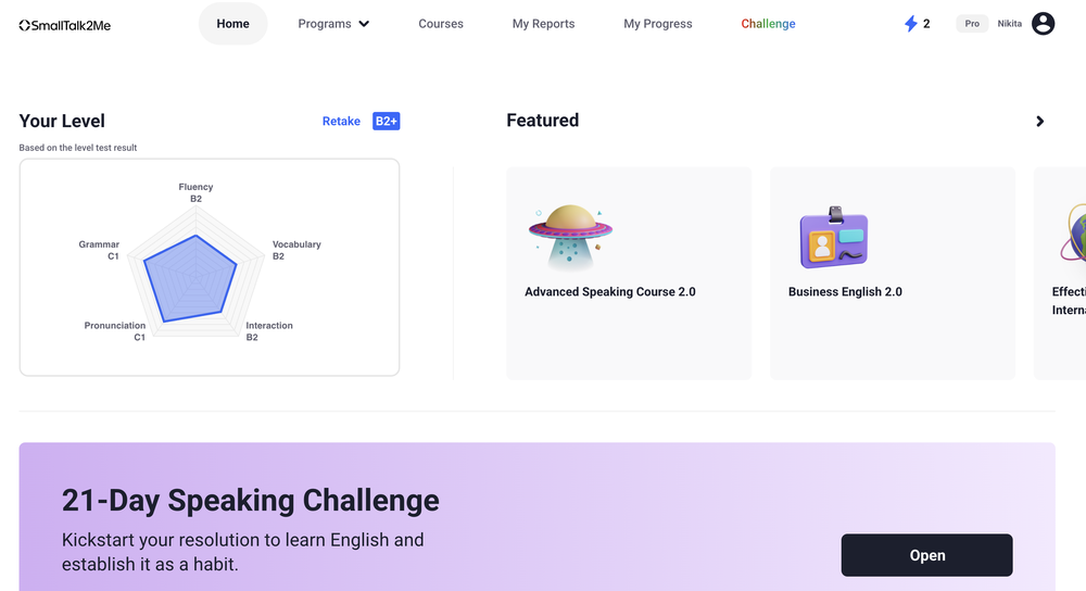 Currently, around 3/4 of the screen is occupied by my level test results, which are outdated and not refreshed over time, as well as by the 21-Day Speaking Challenge banner that remains visible even after the challenge is completed. This makes the main screen feel static and less useful on a daily basis.